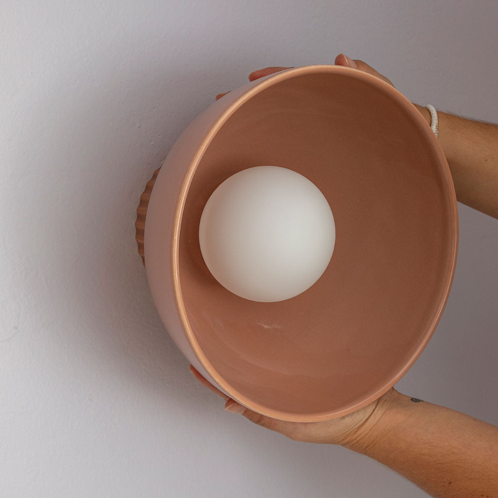 L'applique Coupo en céramique, avec ses courbes rondes et son pied strié original, trouve naturellement sa place dans une entrée, un couloir ou une chambre, seule ou en composition murale. Dotée d'un globe opalin en verre, l'applique Coupo diffuse une lumière douce et chaleureuse.